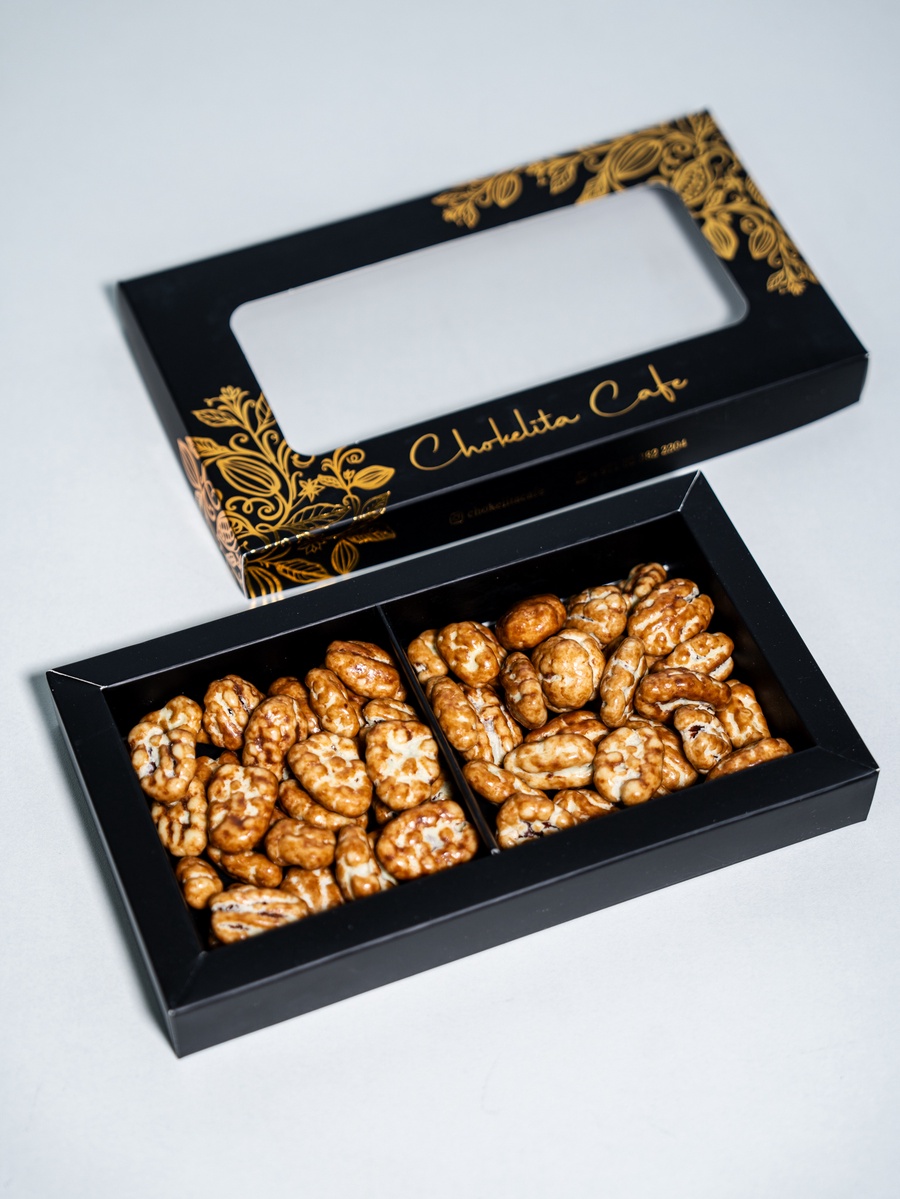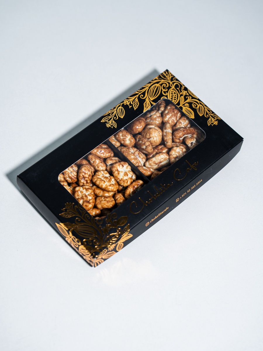 تعرَّف على رفاهية النكهات مع "بيكان كارميل"، الحلوى التي تجمع بين قوام البيكان اللذيذ ولذة الكراميل، مع لمسة من اللوز الشهي. تأسر حواسك بهذه التجربة الرائعة التي تقدمها "بيكان كارميل".